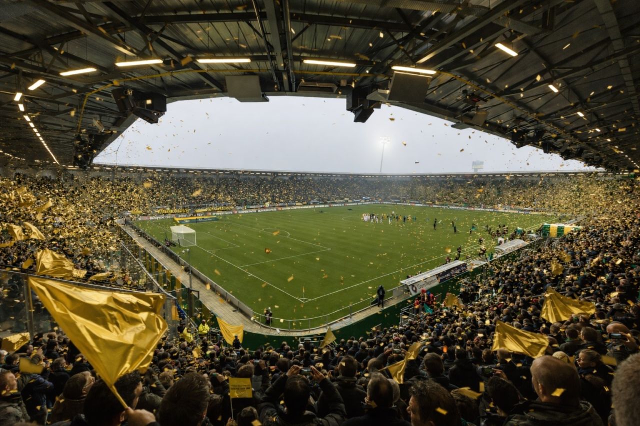 Op vrijdag 23 februari werd in dat gouden tenue met 3-0 gewonnen van MVV Maastricht. Een overtuigende avond, maar de uitslag is niet het enige wat bleef hangen. De opkomst ging gepaard met een regen van goud. Spandoeken kleurden de tribunes. Het stadion voelde als één geheel, alsof veld en vakken tijdelijk samenvielen.